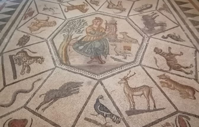 | In the back yard of the Mitropolis of Mytilene there is an impressive mosaic dating from the 3rd or 4th century AD. | |