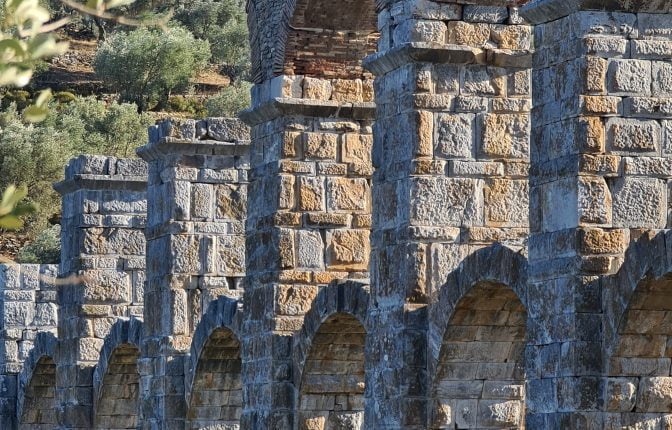 | The Roman Aqueduct of Moria was built to transport water from the springs of Olympus to the ancient city of Mytilene, on a route of about 28 km. It is estimated that it supplied the city with 127,000 cubic meters of water per day.Because of the different ground levels by bridging the valleys with rows of arches the engineer achieved a continuous water flow over irregular terrain. | |